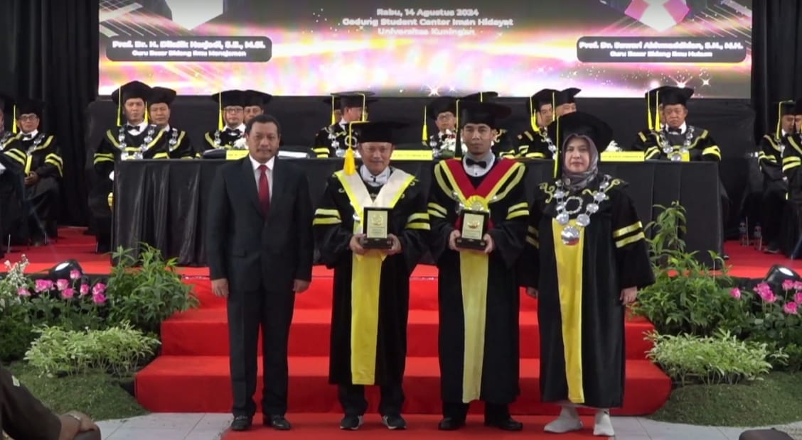 Bingkaiwarta, KUNINGAN – Universitas Kuningan gelar Sidang Terbuka Senat dalam rangka Pengukuhan Guru Besar dan Orasi Ilmiah, Rabu (14/08/2024), di Gedung Student Center (SC) Iman Hidayat kampus I Uniku. Dalam acara tersebut 2 (dua) dosen dikukuhkan sebagai Guru Besar yaitu Prof. Dr. H. Dikdik Harjadi, S.E., M.Si., (bidang ilmu manajemen) dan Prof. Dr. Suwari Akhmaddhian, S.H., M.H., (bidang ilmu hukum)