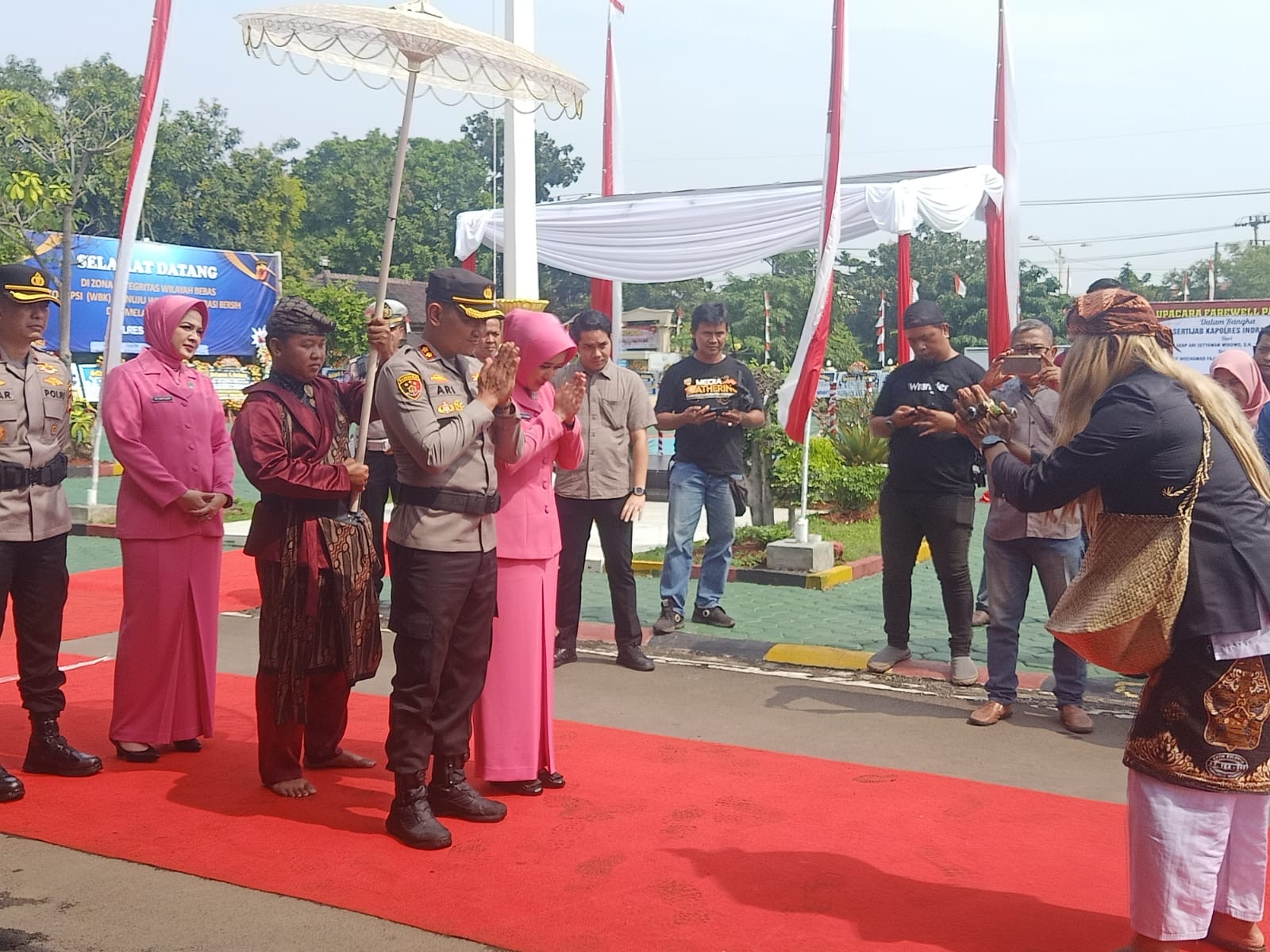 Kedatangan Kapolres Indramayu yang baru AKBP Mochammad Fajar Gemilang disambut dengan pedang pora sebuah tradisi kehormatan dalam menyambut pejabat baru di lingkungan Polres Indramayu, Senin (14/7/2025).