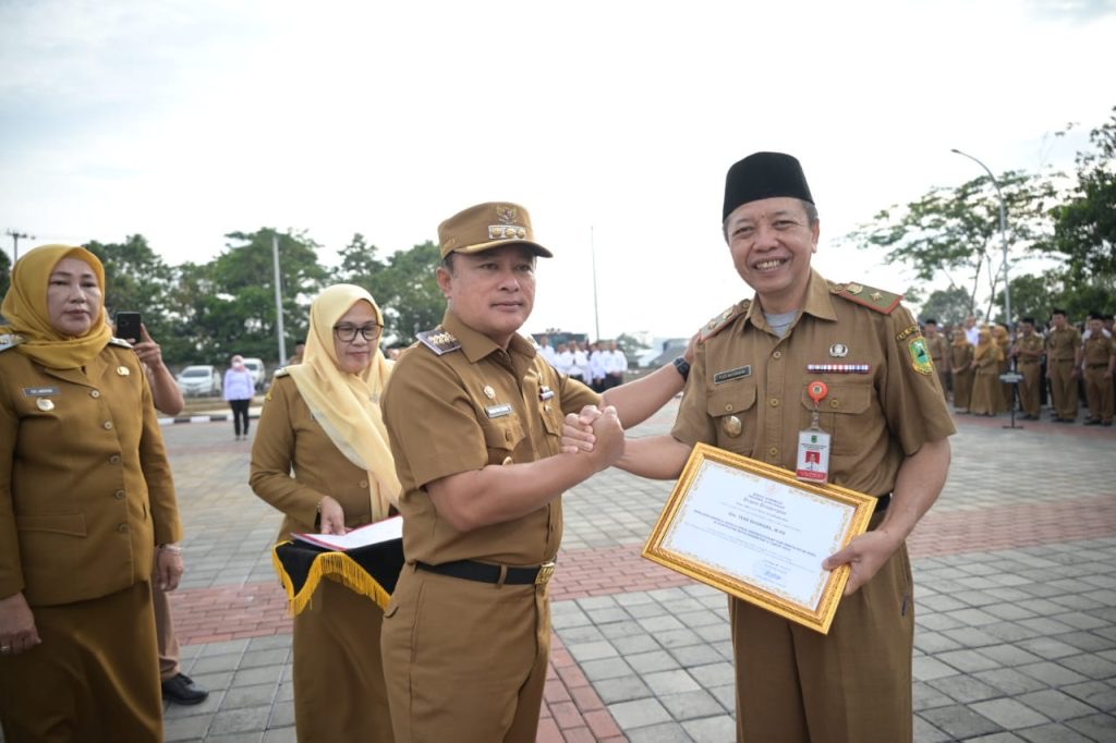 Penghargaan tersebut diserahkan langsung oleh Bupati Kuningan, Dr. H. Dian Rachmat Yanuar, kepada Kepala Disdukcapil, Drs. Yudi Nugraha, dalam apel pagi di Halaman Setda, Komplek KIC, pada Senin (4/8/2025). Turut hadir Wakil Bupati, Pj Sekda, para Asisten Daerah, Staf Ahli, Kepala OPD, serta seluruh peserta apel.