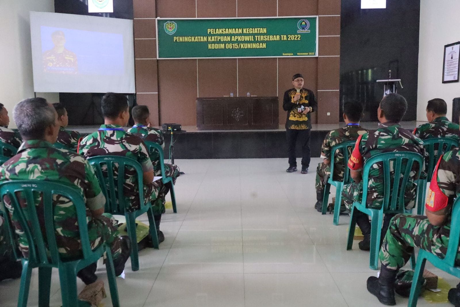 Bingkaiwarta, KUNINGAN – Kepala Diskominfo Kabupaten Kuningan, Dr. Wahyu Hidayah, M.Si, menjadi pemateri dalam kegiatan Peningkatan Katpuan Apkowil, yang bertempat di Aula Makodim 0615/Kuningan, kegiatan ini di buka oleh Kasdim 0615/Kuningan U.S Karlan, SH dan dihadiri oleh para Babinsa se-Kabupaten Kuningan, Kamis (24/11/2022).