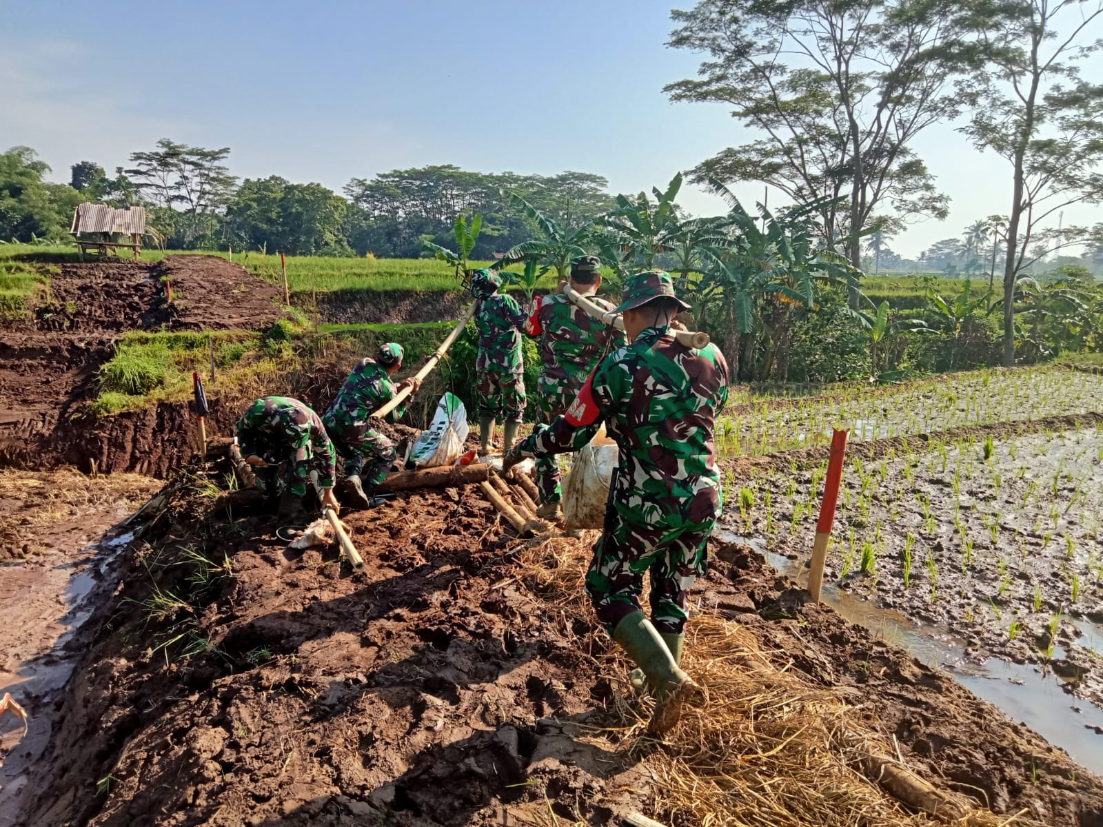 Selain itu, sasaran lain pada kegiatan ini yaitu pembuatan badan jembatan yang masih dalam tahap pelansiran material. “Karena harus dua kali lansiran tenaga manual akibat lokasi yang tidak bisa dilalui kendaraan atau gerobak,” ujar Peltu Didin.