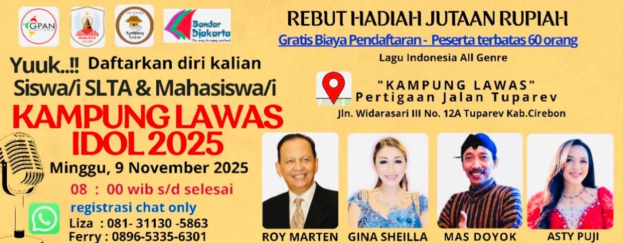 Bingkaiwarta, CIREBON – Semarak Kancah Festival musik di wilayah Cirebon siap kembali menelurkan bibit bibit bertalenta. Kali ini Generasi Peduli Anti Narkoba (GPAN) Cirebon bekerja sama dengan DPP GPAN akan menggelar kompetisi Bernyanyi bertajuk Kampung Lawas Idol 2025 yang akan berlangsung pada tanggal 9 November 2025 di Kampung Lawas Resto & Caffe Cirebon.