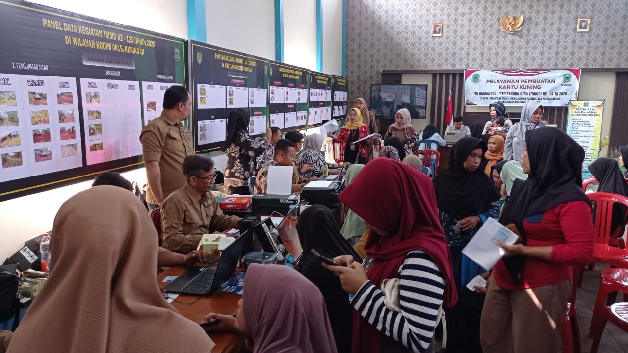 Bingkaiwarta, KADUGEDE – Program TNI Manunggal Membangun Desa (TMMD) ke-125 Tahun Anggaran 2025 Kodim 0615/Kuningan terus berlanjut. Pada H+2 pelaksanaan, Kamis (24/7/2025), TMMD menggelar kegiatan non fisik berupa pelayanan Nomor Induk Berusaha (NIB), sertifikasi halal, dan pembuatan kartu kuning bagi masyarakat Desa Sindangjawa, Kecamatan Kadugede.