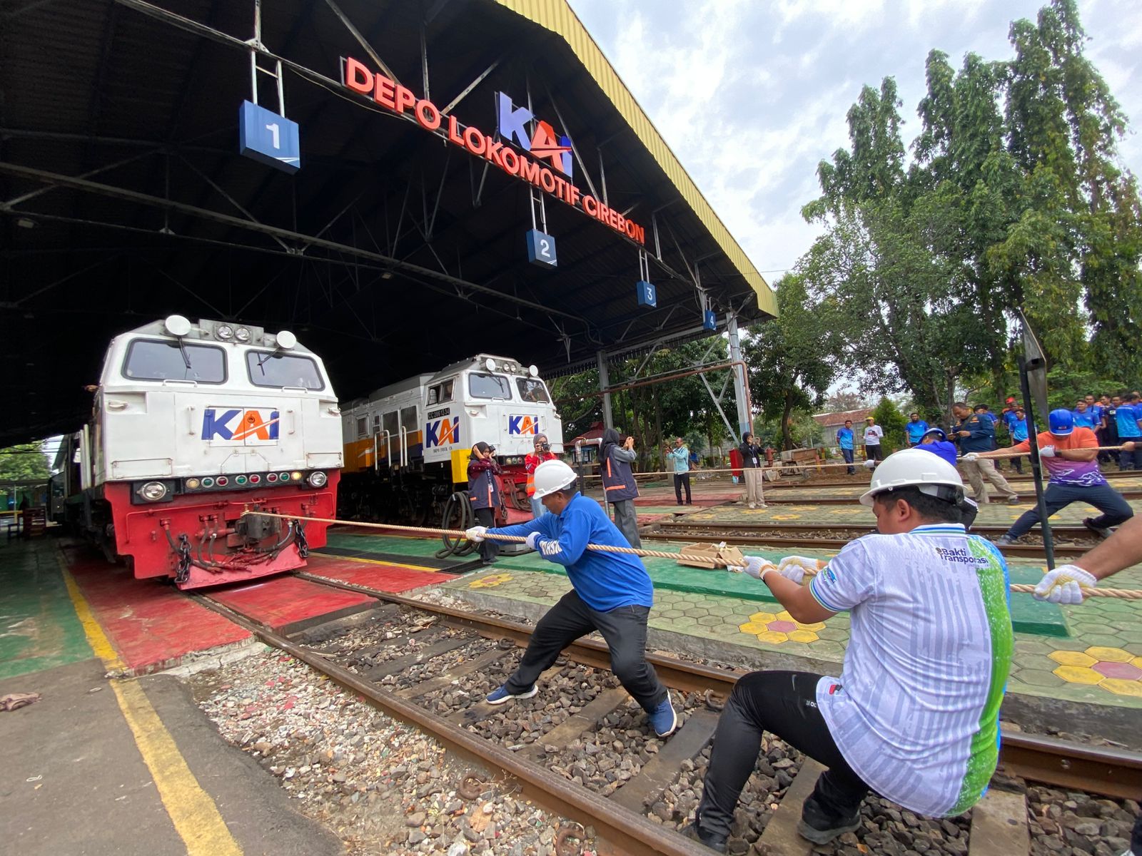 Bingkaiwarta, CIREBON – Dalam rangka memperingati Hari Ulang Tahun ke-80 Kereta Api Indonesia, KAI Daop 3 Cirebon menggelar lomba tarik lokomotif bertempat di Unit Pelaksana Teknis Depo Lokomotif Cirebon pada Kamis (18/9). Kegiatan yang berlangsung meriah ini diikuti oleh para pekerja KAI Daop 3 Cirebon dan dari eksternal diantaranya dari Dinas Perhubungan Kota Cirebon dan Komunitas pecinta kereta api.