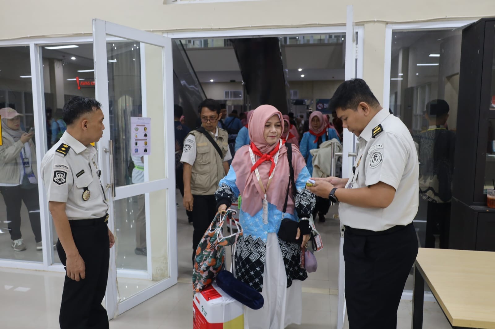 Pemeriksaan Keiimigrasian dimulai dengan proses pemeriksaan keabsahan dokumen perjalanan, memastikan calon Jemaah haji yang akan berangkat memiliki Visa Haji, boarding pass, tidak masuk dalam daftar cegah atau sistem keimigrasian dan peneraan cap tanda keluar.