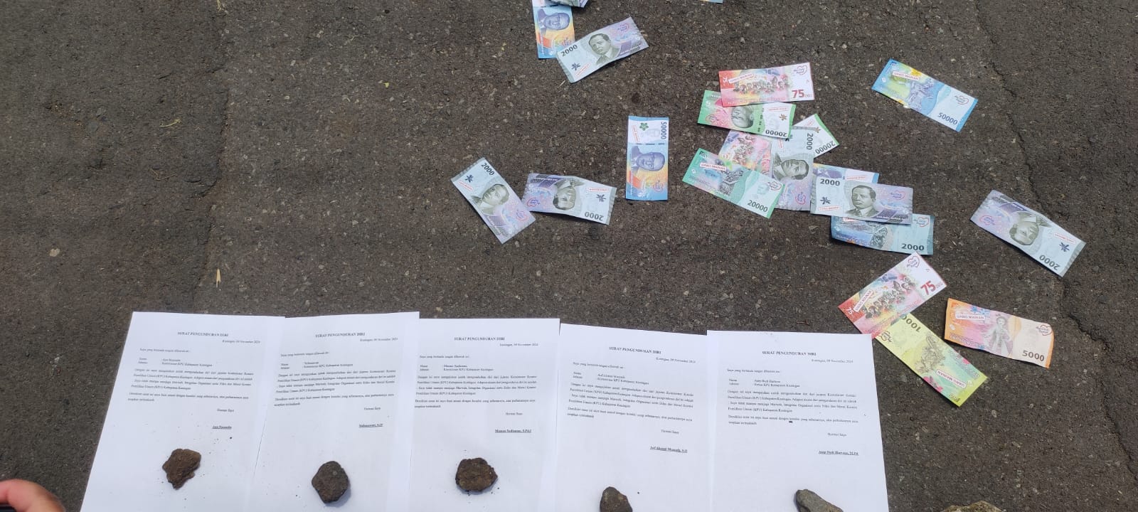 Karena tidak ada satupun komisoner KPU di lokasi, surat-surat digeletakan massa di aspal depan gerbang Kantor KPU Kuningan, seraya ditaburi bunga dan uang palsu. Massa kemudian membubarkan diri.