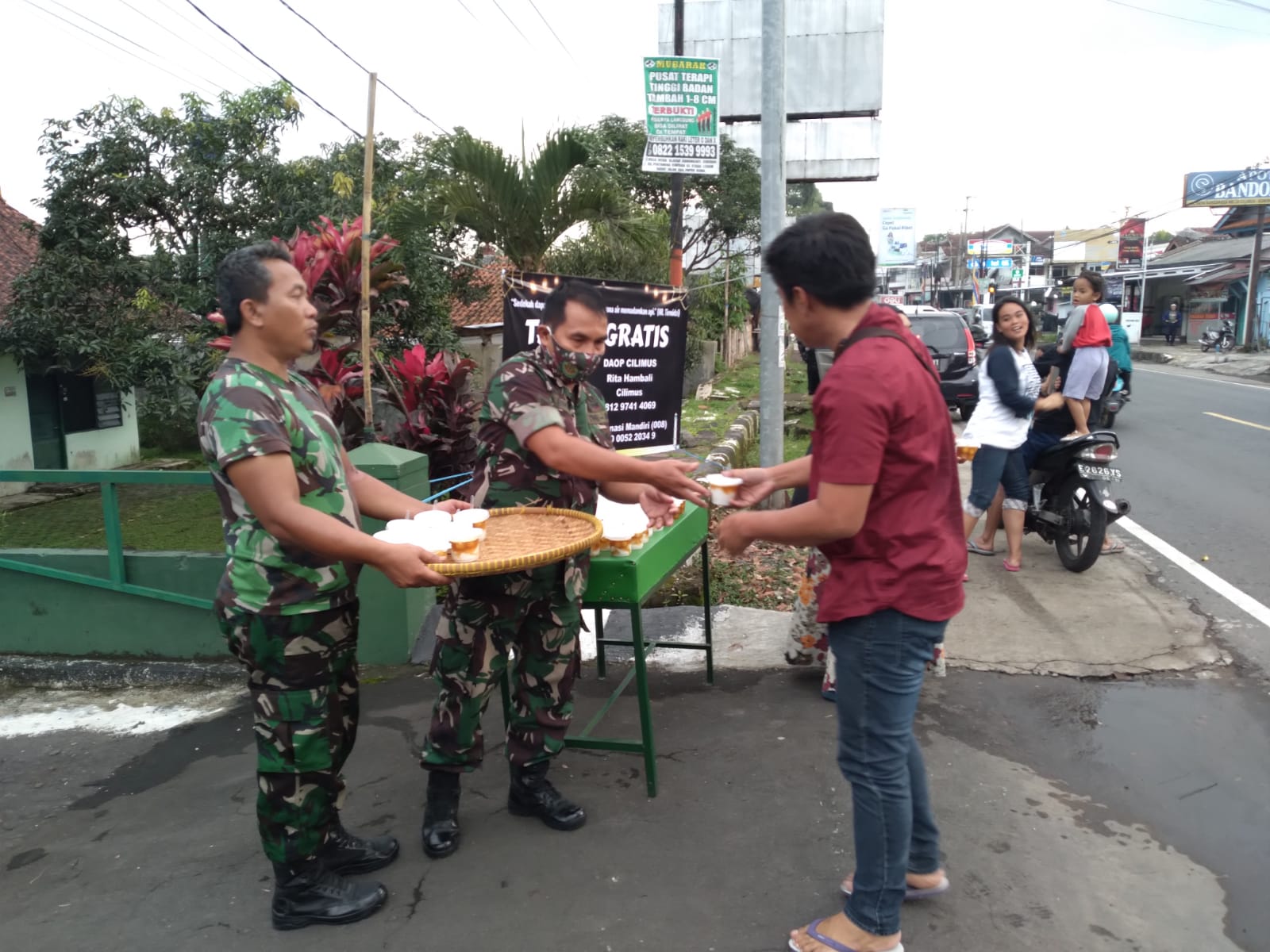 Bingkaiwarta, CILIMUS – Anggota Koramil 1510/Cilimus membagikan takjil gratis pada masyarakat menjelang waktu berbuka puasa. Pembagian takjil ini dilaksanakan di depan markas Koramil, kemarin.