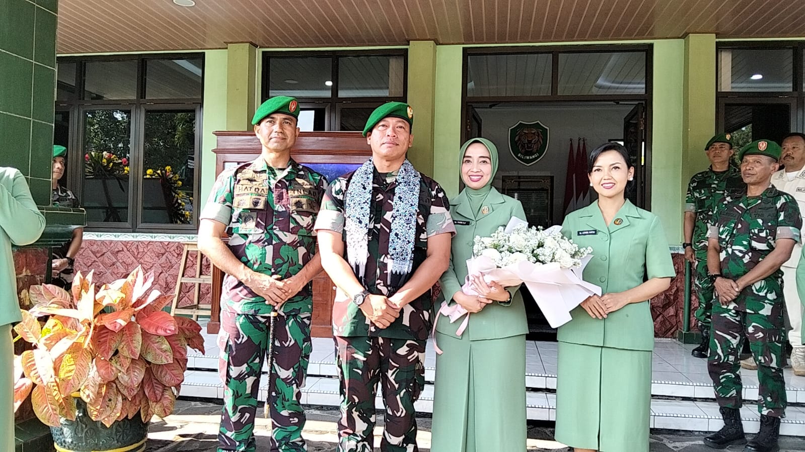 Momen berlanjut dengan prosesi penyambutan pejabat baru, Letkol Arh Hafda Prima Agung, yang disambut penuh khidmat dengan pengalungan syal, penghormatan jajar, hingga serah terima simbolis berupa penempelan foto pejabat Dandim. Prosesi pelepasan pejabat lama yang diiringi Mars Siliwangi pun menambah nuansa haru, ketika Letkol Arh Kiki bersama istri berpamitan kepada seluruh anggota.