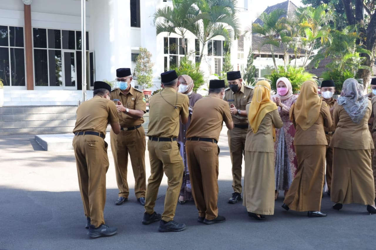 Bingkaiwarta, KUNINGAN – Bupati Kuningan H. Acep Purnama, SH., MH. pimpin Apel Pagi di Halaman Parkir Setda Kabupaten Kuningan, Senin (09/05/2022). Apel ini dilaksanakan sekaligus untuk melaksanakan tradisi bermusafahah dengan para aparatur pemerintah lingkup Setda Kabupaten Kuningan, sebagai rangkaian akhir perayaan Hari Raya Idul Fitri 1443 Hijriyah.