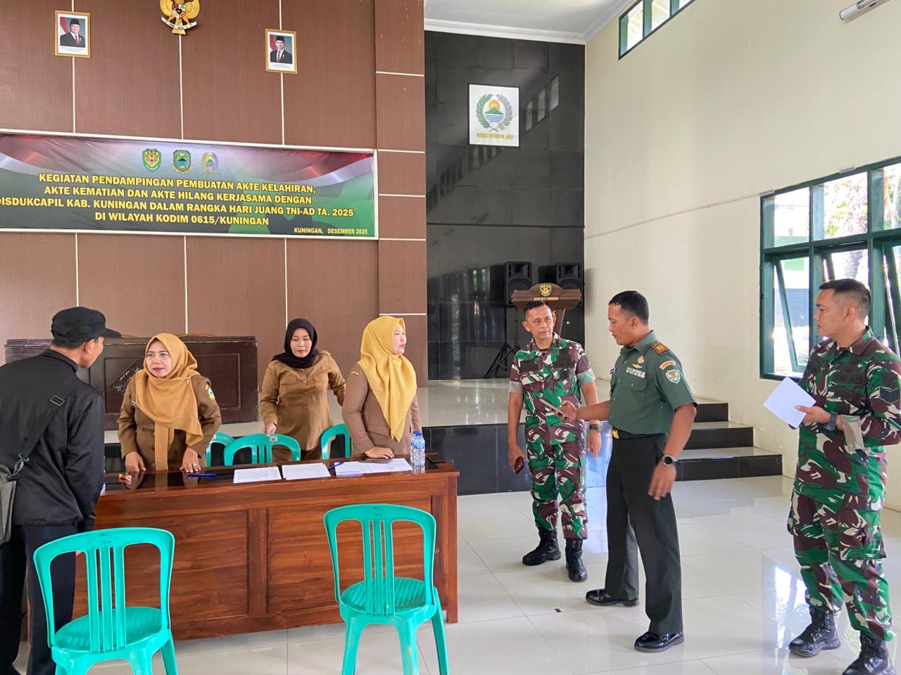 Bingkaiwarta, KUNINGAN – Dalam rangka memperingati Hari Juang TNI-AD Tahun 2025, Kodim 0615/Kuningan menggelar kegiatan Pendampingan Pembuatan Akta Kelahiran, Akta Kematian, dan Akta Hilang. Kegiatan ini dilaksanakan bekerja sama dengan Dinas Kependudukan dan Pencatatan Sipil (Disdukcapil) Kabupaten Kuningan.