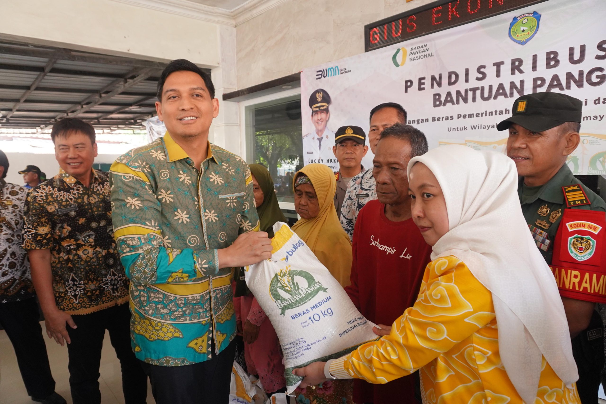 “Ketahanan pangan adalah kondisi tersedianya akses yang andal terhadap pangan sehat dalam jumlah yang cukup dan terjangkau. Pagi hari ini kita membagikan bantuan pangan berupa beras cadangan pemerintah untuk bulan Juni dan Juli, dengan masing-masing 10 kilogram per bulan, yang penyalurannya dilakukan sekaligus di bulan Juli ini,” ujar Lucky Hakim.