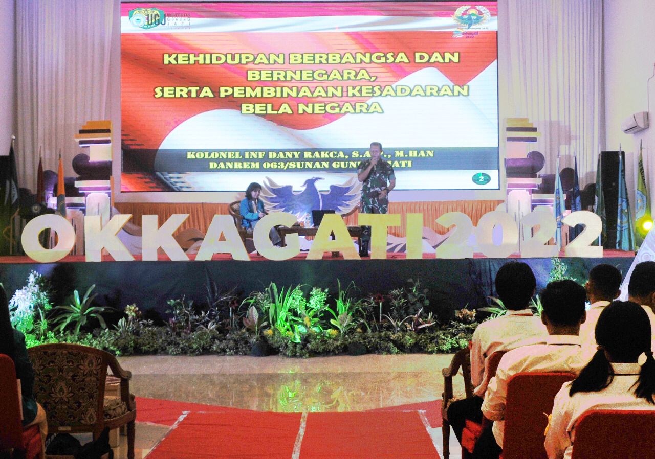 Bingkaiwarta, CIREBON – Danrem 063/SGJ Kol Inf Danny Rakca S.A.P., M.Han memberikan Materi Kehidupan Berbangsa dan Bernegara, serta Pembinaan Kesadaran Bela Negara dalam kegiatan Pelaksanaan Pengenalan Kehidupan Kampus Bagi Mahasiswa Baru (PKKMB) Tahun Ajaran 2022/2023, di Lingkungan Universitas Swadaya Gunung Jati (Unswagati) Cirebon, kemarin.