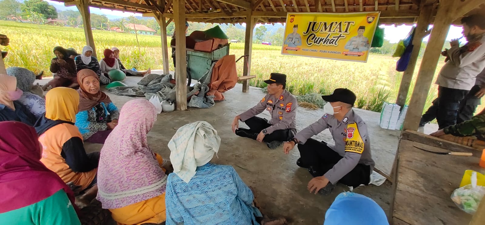 Bingkaiwarta, CIWARU – Kapolsek Ciwaru Polres Kuningan AKP H. Moch. Riffianto mendatangi para petani yang sedang berada di sawah dan diajak untuk ngobrol santai sambil menyantap makanan yang dibawanya. Ia menampung berbagai aspirasi masyarakat melalui program Jum’at Curhat yang dikemas dengan cara ngobrol santai bersama para petani di Desa Baok, Kecamatan Ciwaru, Jum’at (4/11/2022).