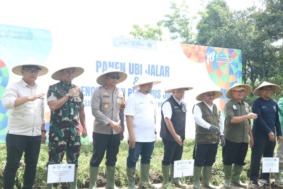 Bingkaiwarta, KUNINGAN – Kegiatan panen ubi jalar yang dirangkaikan dengan pengukuhan Jama’ah Tani Muhammadiyah (JATAM) di Desa Kramatmulya, pada Sabtu (20/12/2025), dijadikan momentum strategis untuk memperkuat ketahanan pangan daerah dan mendukung terwujudnya Visi Kabupaten Kuningan MELESAT (Maju, Empowering, Lestari, Agamis, Tangguh). Hal itu ditegaskan oleh Kepala Dinas Ketahanan Pangan dan Pertanian (Diskatan) Kuningan, Dr. Wahyu Hidayah.