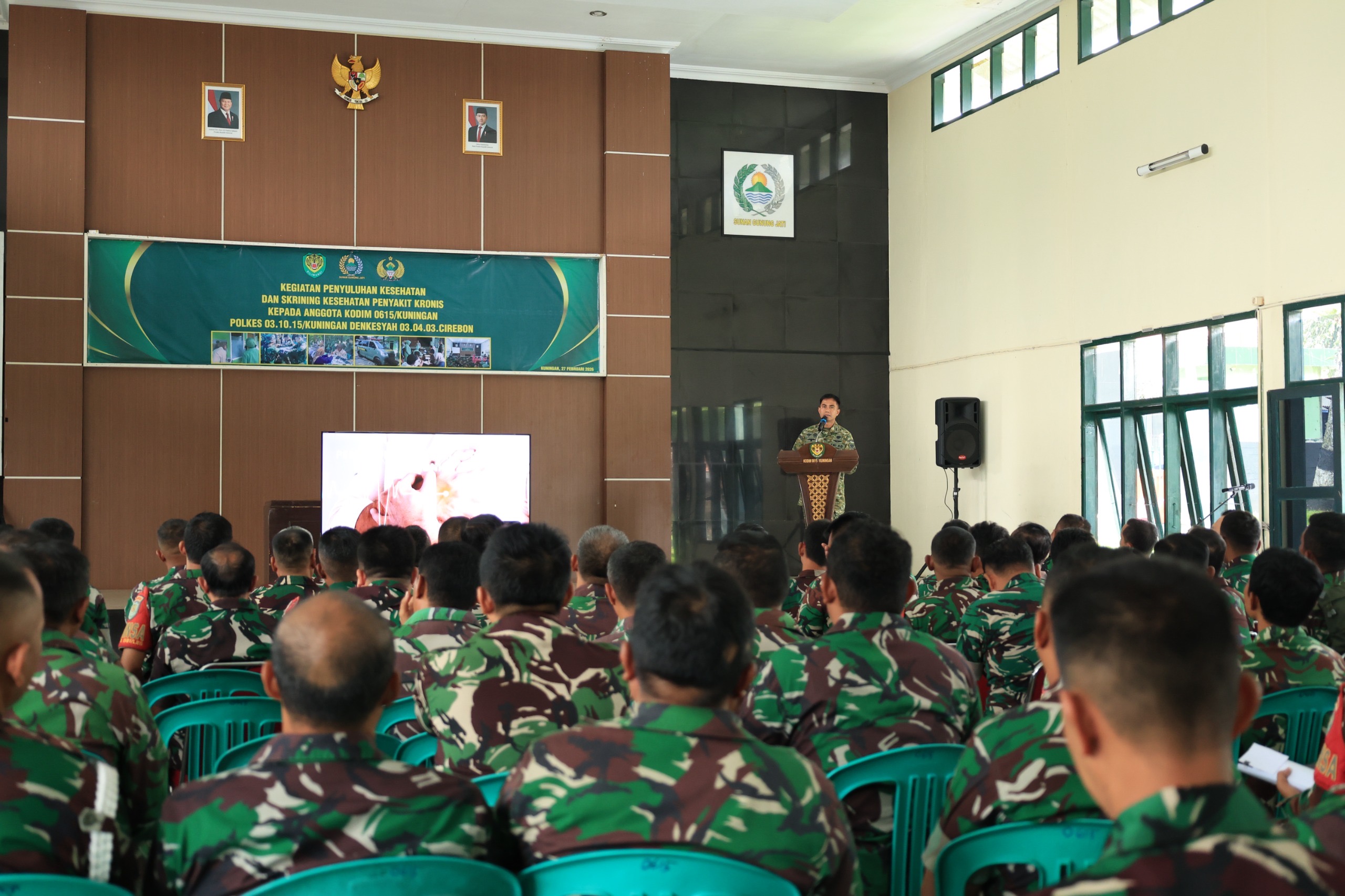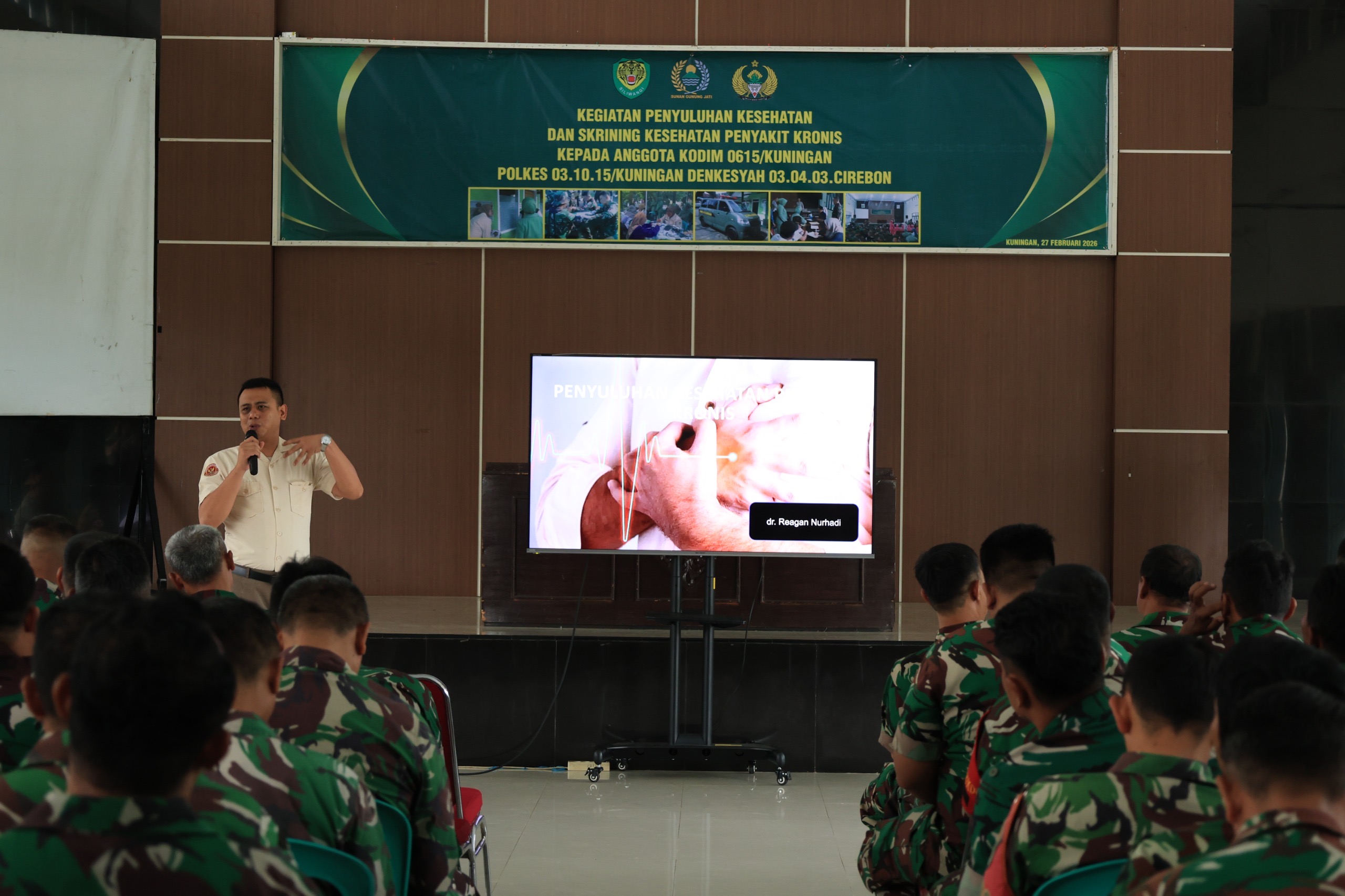 Bingkaiwarta, KUNINGAN – Untuk meningkatkan derajat kesehatan prajurit serta mendukung kesiapan operasional satuan, Kodim 0615/Kuningan bekerja sama dengan Polkes 03.10.15/Kuningan dibawah naungan Denkesyah 03.04.03 Cirebon, menggelar kegiatan penyuluhan kesehatan dan skrining penyakit kronis, di Aula Mashud Wisnusaputra Jl. RE. Martadinata No. 97 Kelurahan Ciporang Kecamatan Kuningan, Jumat (27/2/2026).