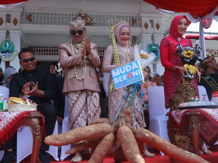 Singkong diserahkan oleh Dr. Wahyu Hidayah kepada Pj. Bupati Kuningan. Singkong raksasa yang diserahkan, merupakan simbol kekayaan hasil bumi serta dukungan generasi muda tani terhadap pelestarian budaya lokal. Singkong (Manihot utilisima atau Manihot esculenta crantz) merupakan salah satu tanaman yang tersebar luas di Indonesia yang sudah banyak dibudidayakan di berbagai negara di dunia. Pangan yang satu ini merupakan pangan lokal yang banyak dikonsumsi masyarakat Kabupaten Kuningan, dan dapat diolah menjadi berbagai makanan enak.
