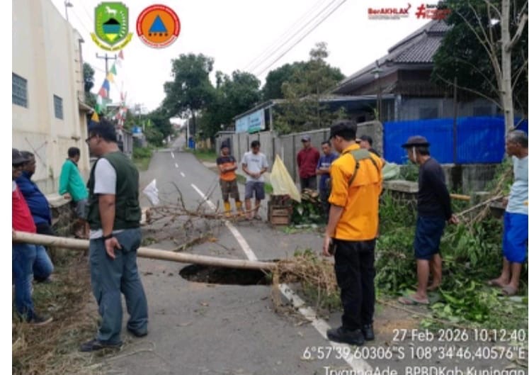 Bingkaiwarta, CIAWIGEBANG – Bencana tanah amblas mengguncang Dusun Pasir Tengah RT 001 RW 001, Desa Karangkamulyan, Kecamatan Ciawigebang pada Kamis (26/2/2026) pukul 16.27 WIB. Peristiwa ini mengakibatkan akses jalan kabupaten penghubung Kecamatan Ciawigebang dan Cihaur terputus total, tidak dapat dilalui baik kendaraan roda dua maupun roda empat.