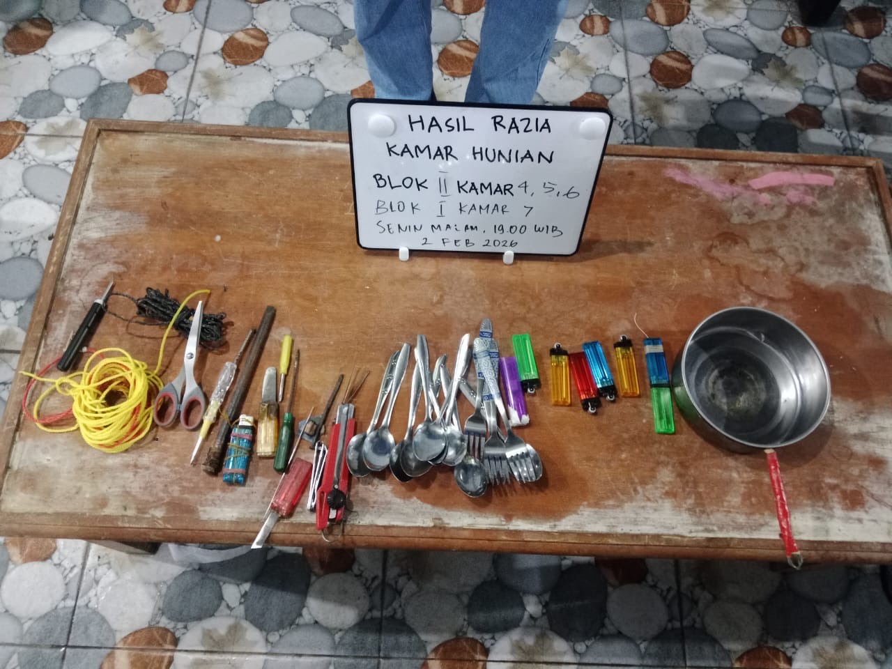 Dalam penggeledahan teliti tersebut, petugas berhasil mengamankan sejumlah barang terlarang yang berisiko membahayakan keselamatan warga binaan maupun petugas. Barang bukti yang disita meliputi pisau rakitan, cutter, gunting kecil, sendok besi, kaca, jarum jahit, hingga kabel listrik.