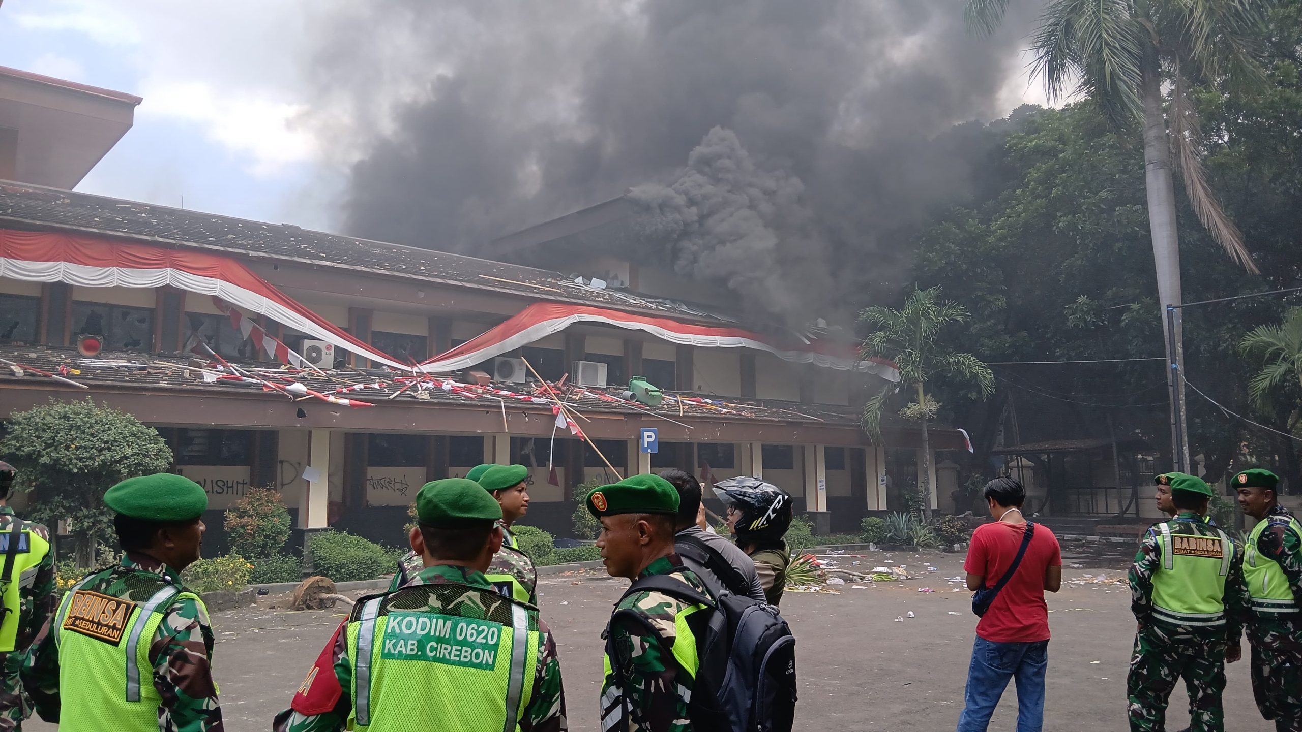 Kondisi di sekitar Gedung DPRD Kabupaten Cirebon masih mencekam. Aparat kepolisian dan TNI disiagakan untuk mengantisipasi kerusuhan susulan. (ARL)