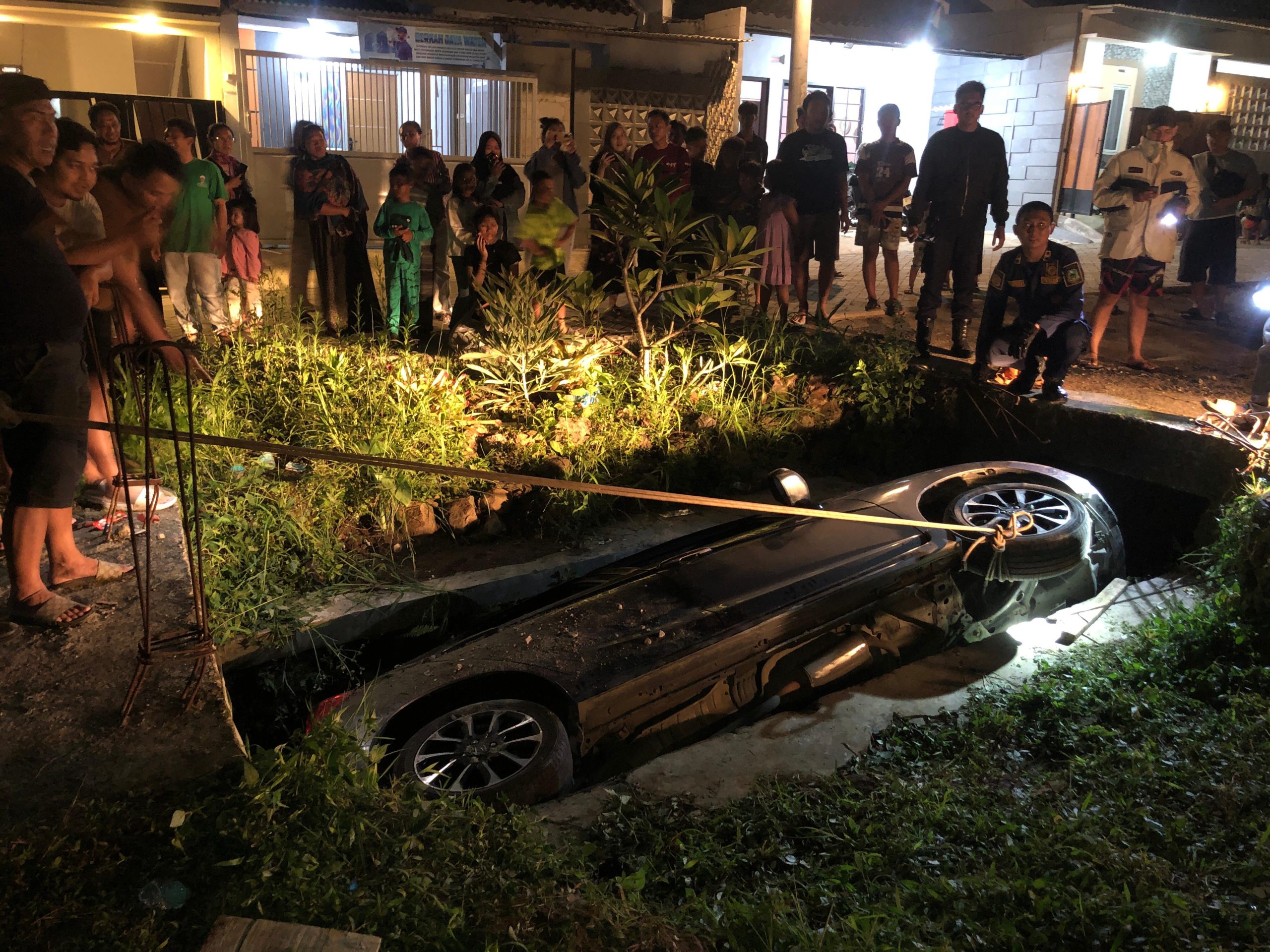 “Harus menggunakan crane jika posisi mobil dan got nya se-sempit ini, sehingga mobil bisa dievakuasi langsung vertikal keatas”, ujar salah satu petugas damkar yang ada dilokasi.